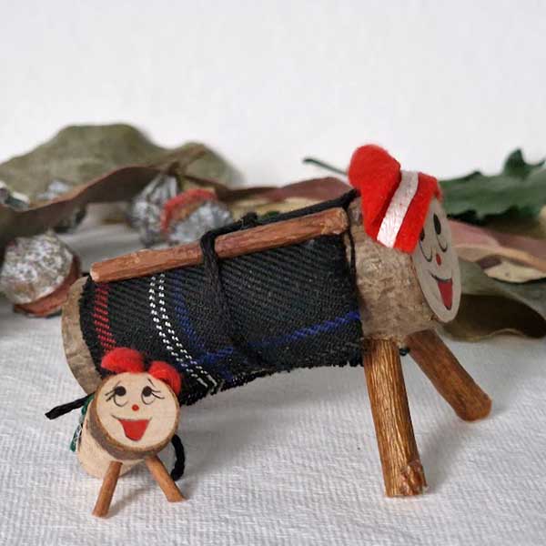 Tió i Tiona Afectuosos. Amb tots els complements necessaris, llaç vermell i negre típic catalana, manta, pal a mida del tronc.