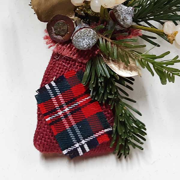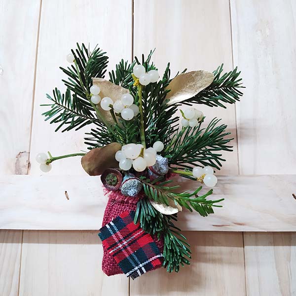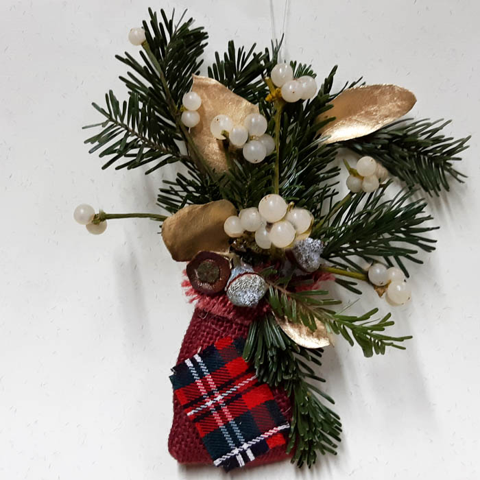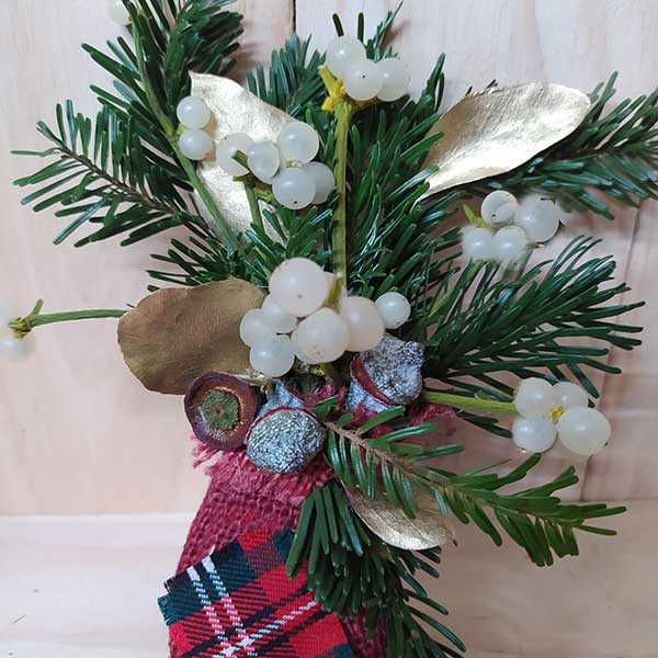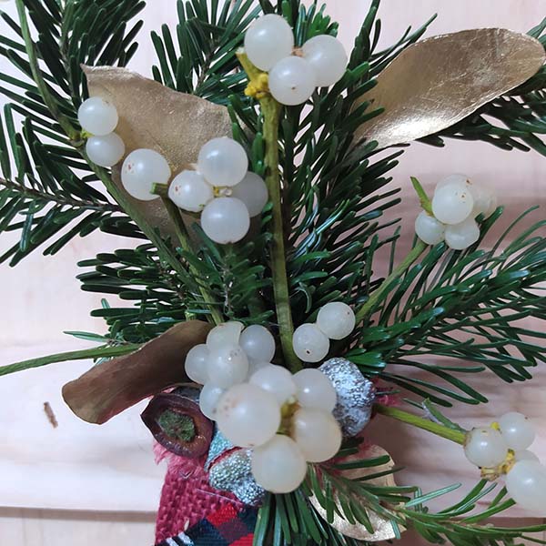 Adorn de vesc en ram compost per, avet, eucaliptus populós daurat, baies d’eucaliptus sec, amb les tiges al sac de jute de color decorat amb tela Escocesa típica de Nadal, amb tot això fem el ram de lligat amb ràfia que al seu cop serveix per penjar-lo en el marc de la porta, l’arbre o en un gerro.